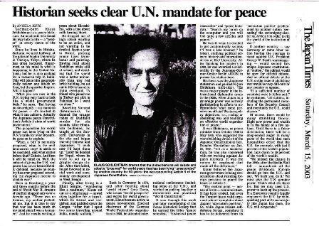 彼は現在、埼玉県の日高市に住んでいる。私たちは、ちょうとジャパンタイムズ社との中間地点にある、彼がかつて教鞭をとっていた上智大学の校門前で会うことにした。彼の最大の関心事は国際連合に何が起こっているかだったが、インドへ研究旅行に出かける準備中でもあった。これは彼をアメリカのイラク攻撃から近い場所に置くことになる。彼の当面の疑問は、そこで何が起こるのか?・・・ということであった。