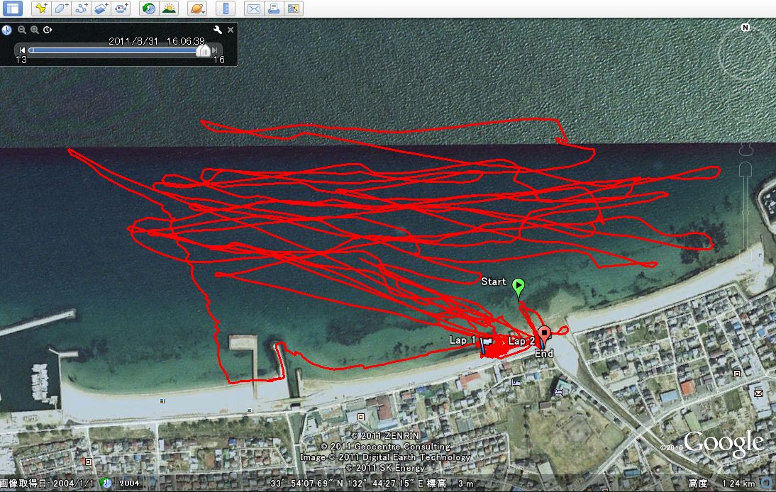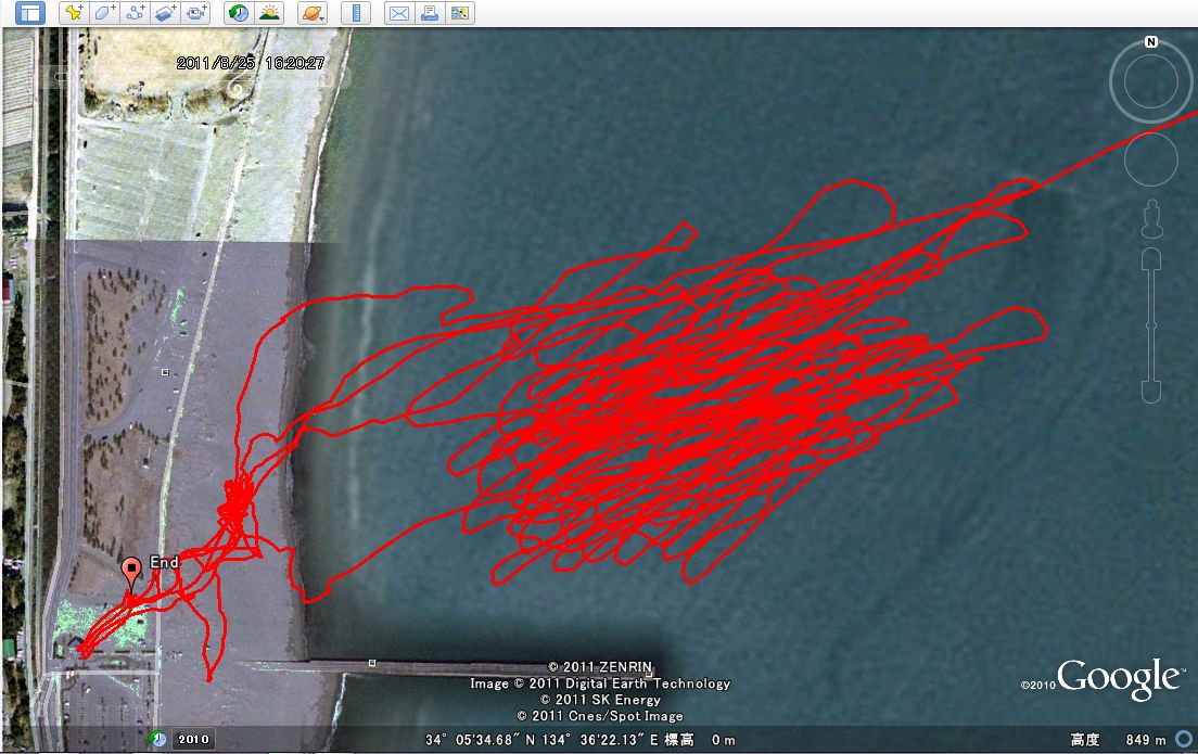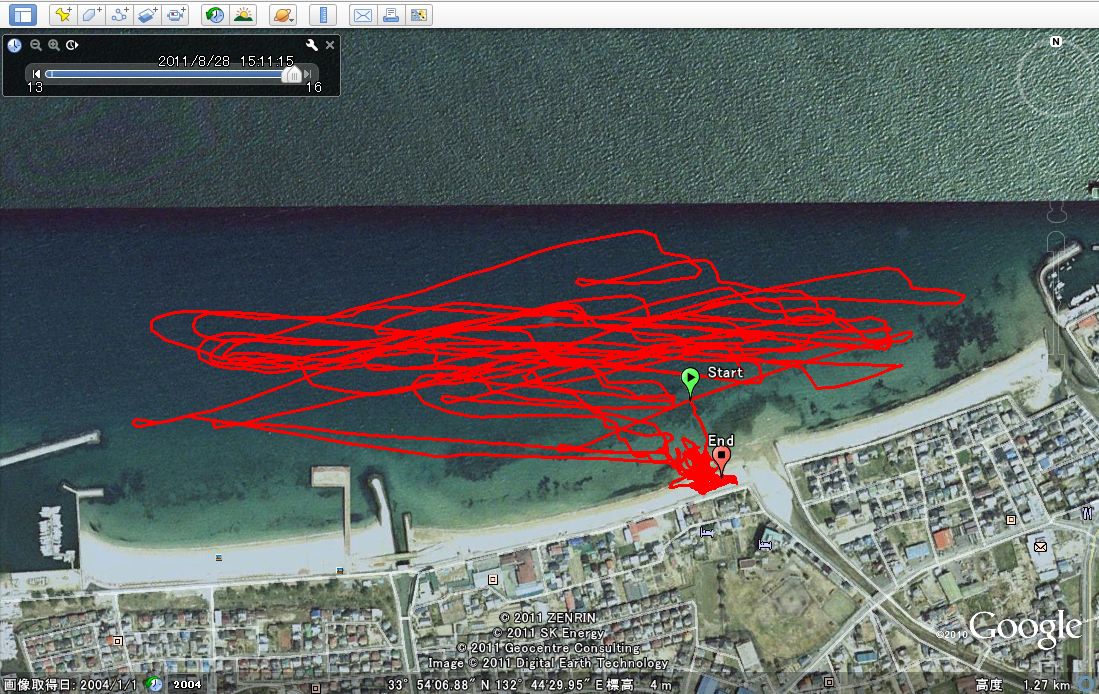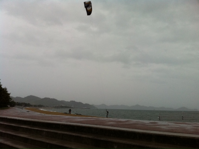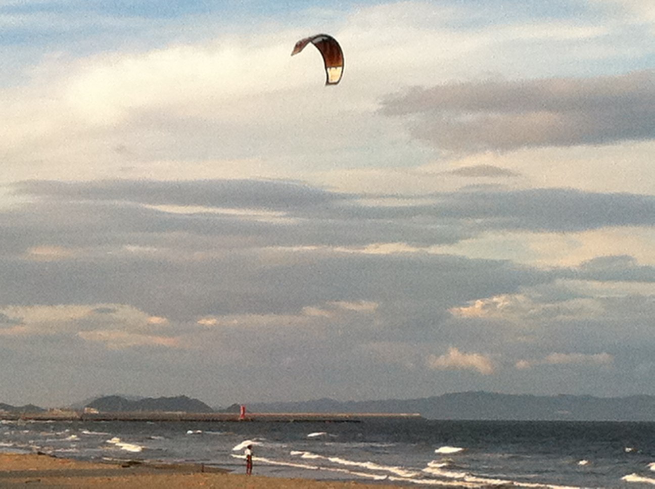昨日と似たような気圧傾斜だったので、それなりの北風が入るだろうとは予想していたが、昼を過ぎてから6m程度まで上がってくれた。カトちゃんが12㎡で練習を始めるにはちょうど良い風。基本操作は5㎡ですでに身に付いている。初対面の12㎡ラムエアの扱い方の要点だけを説明して、私は19㎡で1時間ほど走る。