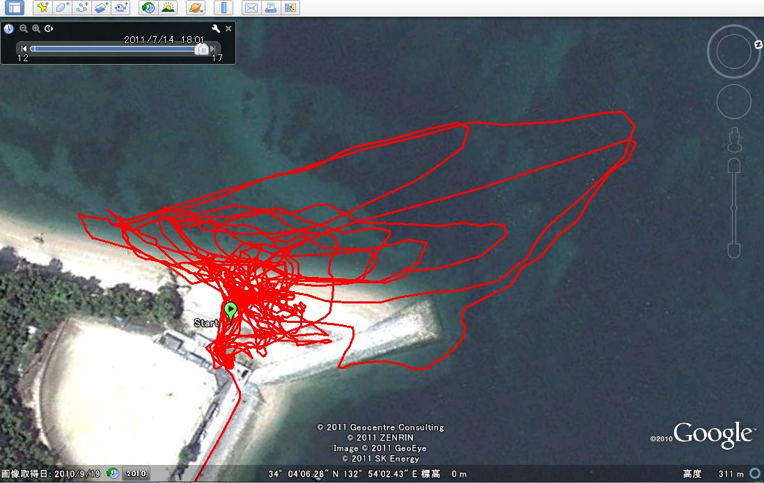 15分ほど泳いで、岸に帰りしばらくすると、海保の一人が「この辺りでパラグライダーが墜落した・・・という通報があったのですが、何かご存じないですか~?」と波除堤防の上から声をかけてきた。「こんなとこで普通パラは飛ばないから、それはたぶん私のコレと見間違えたのでしょう」「ああ、そうですか~・・・・ところで、それはなんというモノですか~?」「カイトサーフィンといって海の上で遊ぶスポーツの一種です」「ああ!そういえばテレビで見たことがあるような気がします!・・・しばらく見学させて頂いてもいいですか?それと、写真も撮らせて頂いてもいいですか?」「もちろん、ご自由にどう~ぞ^^」 なかなか気持ちの良い海保の青年だった。