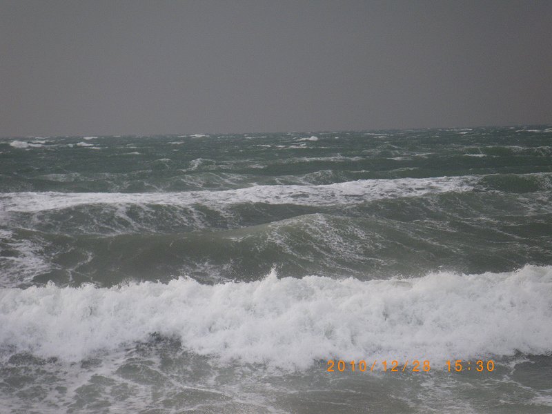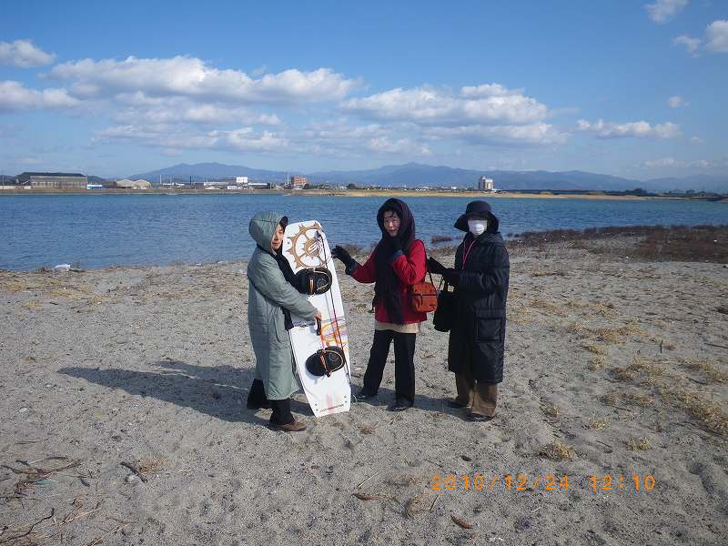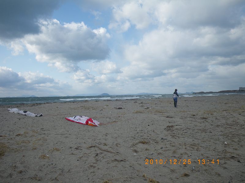 昨日はちょっと珍しいこともありました。カイトのセットアップをしていると、特に何をするという風でもなく海岸をブラブラと歩いている3人の婦人がいる。この寒い冬空、街着のコートに身を包んでいったい何をしているのだろう?