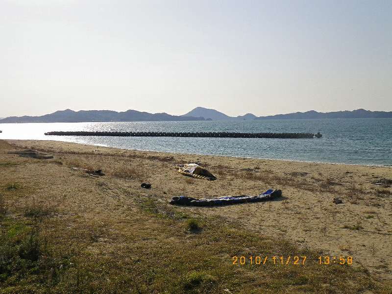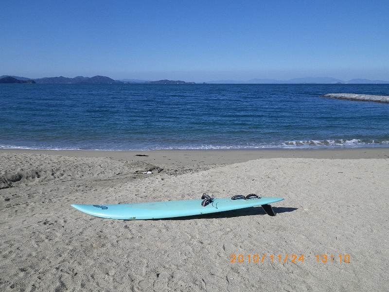 秋の陽光に誘われるように昼ごろには堀江へ。東寄りの微風が爽やかで、かなり沖には白波が見えます。すぐには走らせてくれそうもありませんが、まあ、カイトのリペアでもしながら待ちましょう・・・と、のんびり準備をしていたら、間もなく柔らかい北東風が入ってきました。