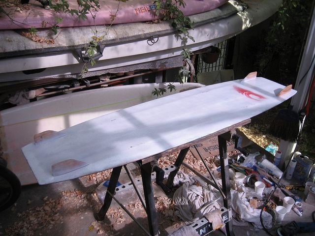フォームのシェイプは終わっている。今回のボトムは極めて浅いシングルコンケーブにしてある。ロッカーは浅めに仕上げるつもりだ。フィンは桧にFRPをコーティングしたもので充分実用に耐えることが分かったが、今回はFRPだけで整形した。
