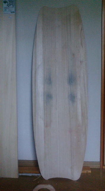 短い板の購入も考えたが一本10万は安い買い物ではない。これは消耗品のカイトの方に回す方が賢明だろう・・・ということで、自分で作ってみることにした。FRPの積層はウィンドで慣れている。芯材のシェイプも桐材なら楽だろう。7月に入って時間を見つけながらコツコツ楽しんだ。130cm×38cm。ペイントの順番を間違えてあんまりきれいな出来ではないが、今日でほぼ完成した。