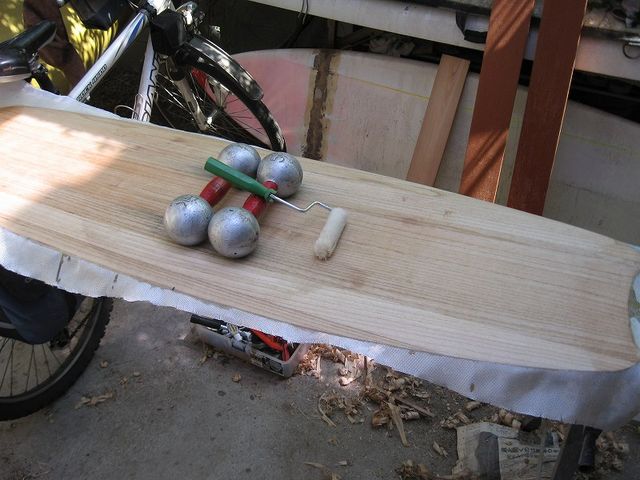 昨日はデッキの、今日はボトムのクロスがけに入った。今回は同時に板にロッカーを付けるために5kgの鉄アレイを2個使う。