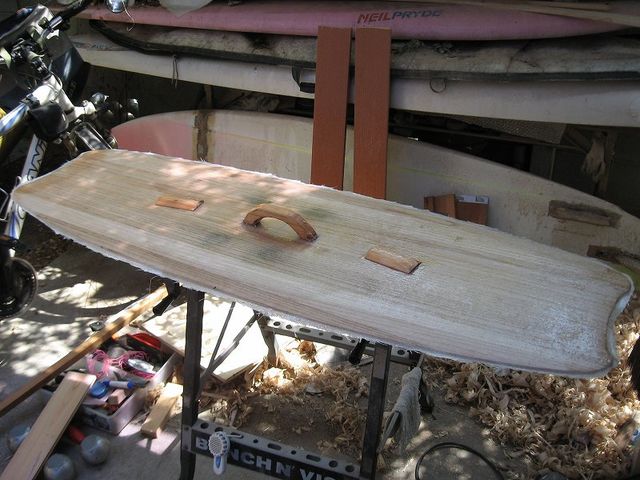 多少の工夫はボトムをクアトロコンケーブにしたこと。フィンの芯材にヒノキを使ったこと。デッキパットはダイソーの300円サンダルだ。あとストラップをねじ止めして、フィンに色を付けたらおしまい。