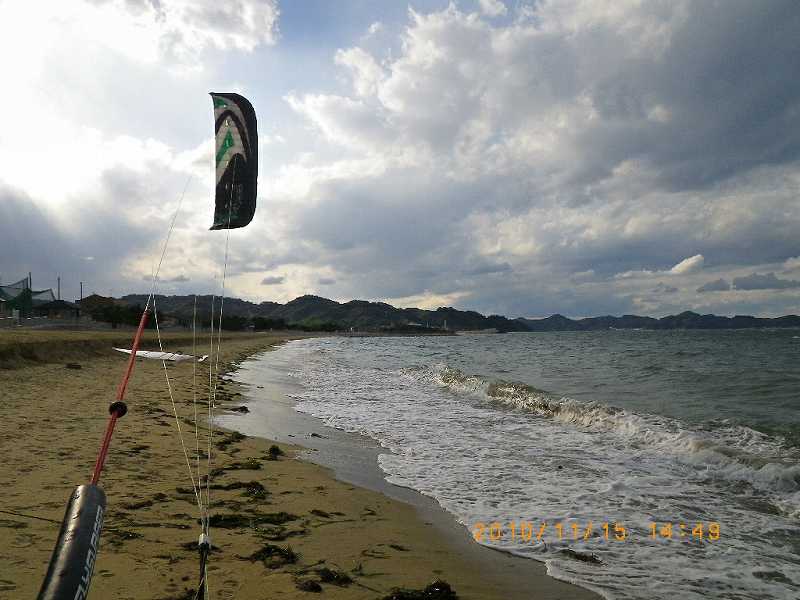 暖かい西風・・・運良く臨時休みになったM君からの連絡もあり、仕事が一区切りついたところで塩屋へ・・・幾分強弱はありますが。5m~6mほどの気持ちが良い空気の動きです。12㎡二回目の練習には最適でしょう。しばらく、陸トレで体を温めた後、いよいよ板をはいて初乗りに挑戦することになりました。