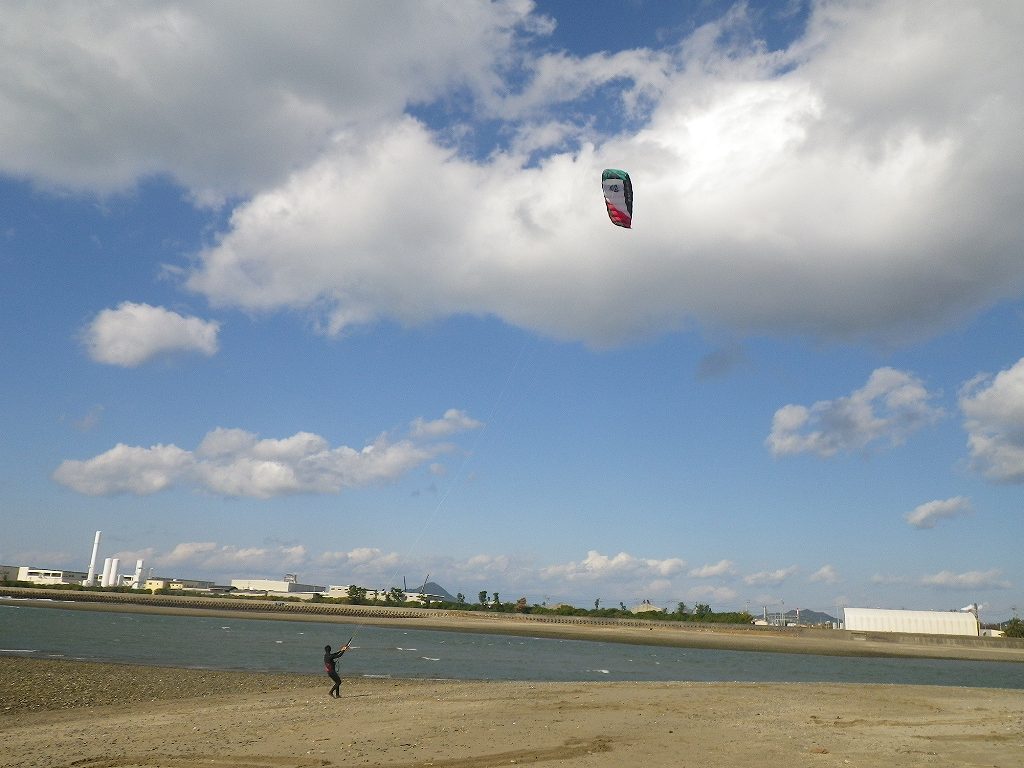 しばらく風に吹かれてなかったS君はやる気満々で、「今日は吹き飛ばされてみたいなー!」などと言う。「よし!塩屋なら、それもよかろう!」・・・ということで、少なくとも地上練習では安心して使えるバイロン6㎡で1時間半ほど。私も10㎡を上げてはみたが、何もできそうもないのですぐに撤収。なんにしても、心地良い午後の一時だった。