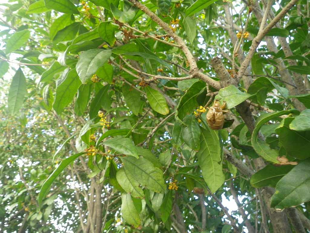 昨秋に続いて今秋もキンモクセイが二度咲きした。再び、あの美しい香りが我が家の周辺を満たしている。セミの抜け殻はまだ頑固にくっ付いている。